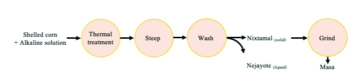 Originating in Mesoamerica, nixtamalization is the alkaline (lime, Ca(OH)2) cooking of corn. The alkaline solution degrades and removes the pericarp, softens the endosperm structure, and allows diffusion of water and calcium ions into the inner starch portion of the kernel which may have an influence on mycotoxin contamination (Figure 1). In the traditional nixtamalization process (Figure 2), after alkaline cooking, corn kernels are steeped for approximately 24 h, and are later washed to remove the remains of the pericarp and excess calcium (8, 10, 19).