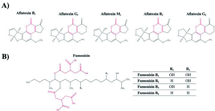 Fig. 3. Examples of aflatoxin and fumonisin chemical structures. The aflatoxin lactone ring and tricarballylic acid moieties from fumonisin are marked in red.